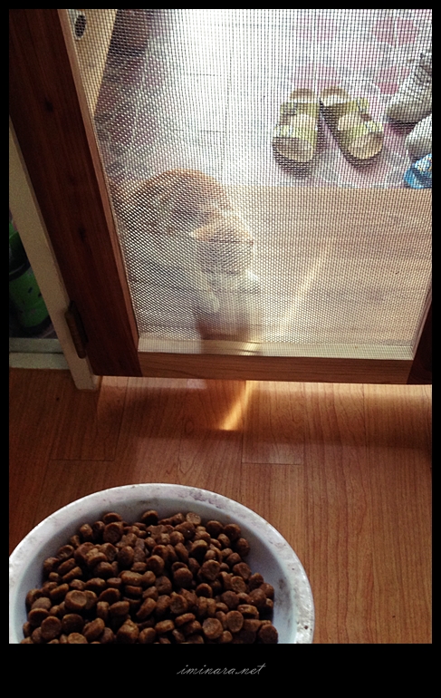밖에 놔둔 사료가 다 떨어져서 안에서 충당하려고 그릇 들고 들어갔더니